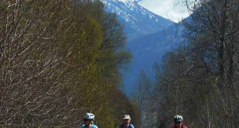 Bicyclists enoying spring sunshine on the Bird-to-Gird Trail near Anchorage. Photo by Susan Sommer.