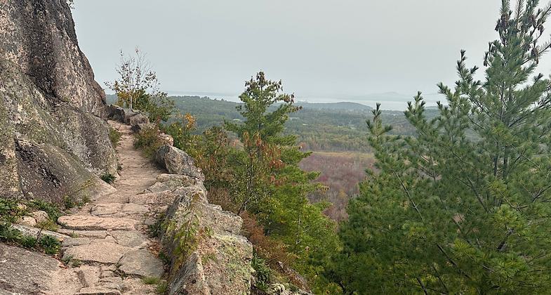 This NRT is now actually Emery Path and Schiff Path. Start on Emery Path from Sieur de Monts and take it up to Schiff, then continue on Schiff to the summit of Dorr Mtn. Both Paths are gorgeous and offer plenty of views over the water and islands. Lots of stone steps and stone paths and, up top, ledges. 360-degree views on summit area. No scrambling required unless you want to take a connector trail from the summit over to Cadillac. Lovely hike.