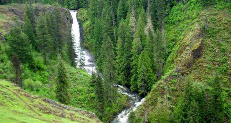 This wide, well-maintained trail is actually an old wagon road that provides access to settlements along the Clearwater River. This series of trails provides access to three falls that comprise Elk Creek Falls.