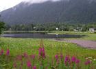 Swan Lake in the town of Sitka on Baranof Island, southeast Alaska, USA, viewed from Halibut Point Road; fireweed flowers in for. Photo by Sepheng3.