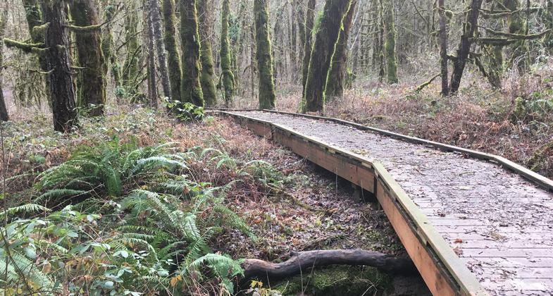 This loop trail begins and ends at the trailhead parking lot. An interpretive brochure for this hike is available at the trailhead. The trail begins in an oak woodland habitat and then climbs slightly to an overlook that allows exceptional views of the Willamette Valley and the Cascade Range. Here you also get a good view of Bald Top, which is a native oak savanna habitat. The trail continues into a forest dominated by Douglas fir. As the trail drops down you start to see mature maples and evidence of past logging. Interpretive signs along the trail provide information about different animals and their habitats. This is an excellent trail for bird watching and is enjoyable in the summertime because most of the trail is under the forest canopy.